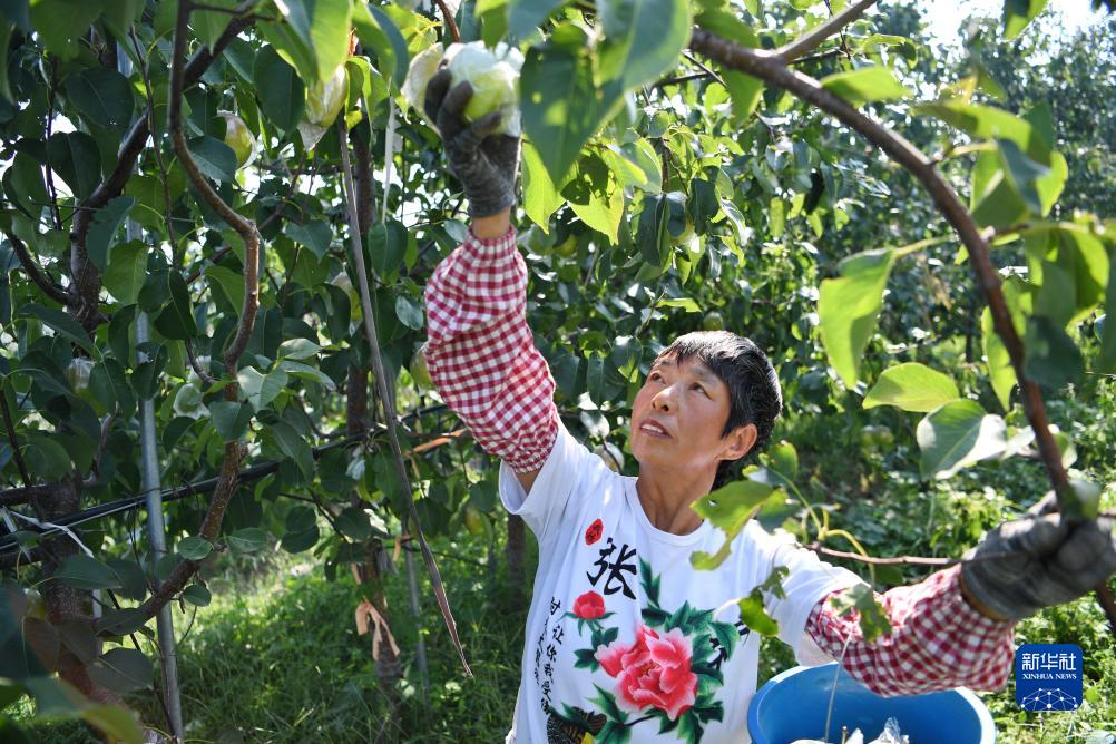 9月15日,農民在河北省玉田縣唐自頭鎮一處經荒山開發而建的果園內採摘鮮梨。