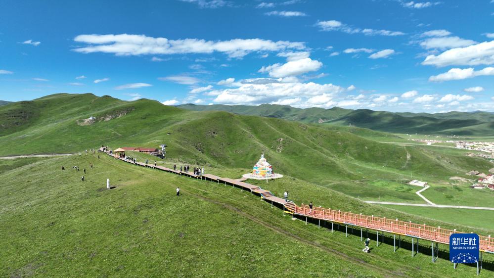 游客在甘南藏族自治州瑪曲縣阿萬倉濕地的觀景步道上游覽(7月6日攝,無人機照片)。