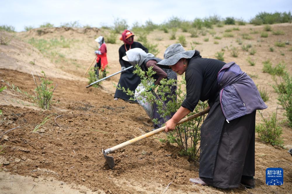 牧民在瑪曲縣歐拉鎮黃河沿岸一處沙化草原治理點補種草籽(7月6日攝)。