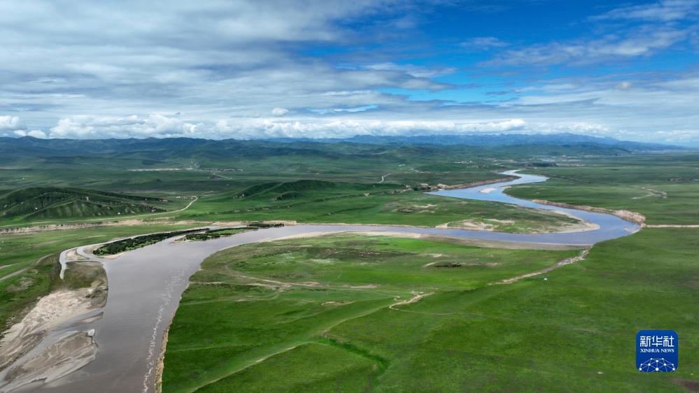 瑪曲縣黃河兩岸綠意盎然(7月6日攝,無人機照片)。