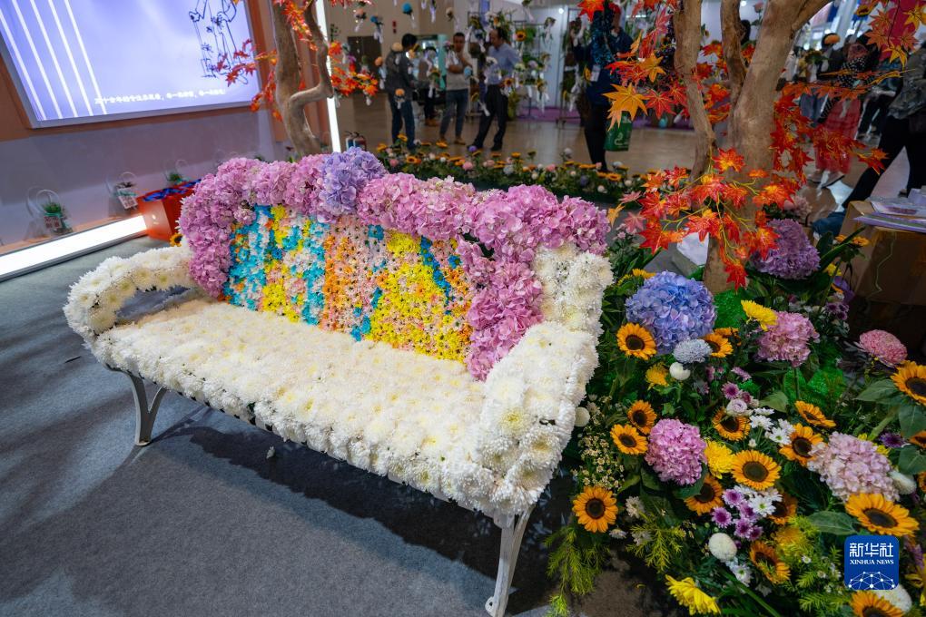 這是9月15日在第二十一屆中國昆明國際花卉展上拍攝的一張由鮮花裝飾的長椅。
