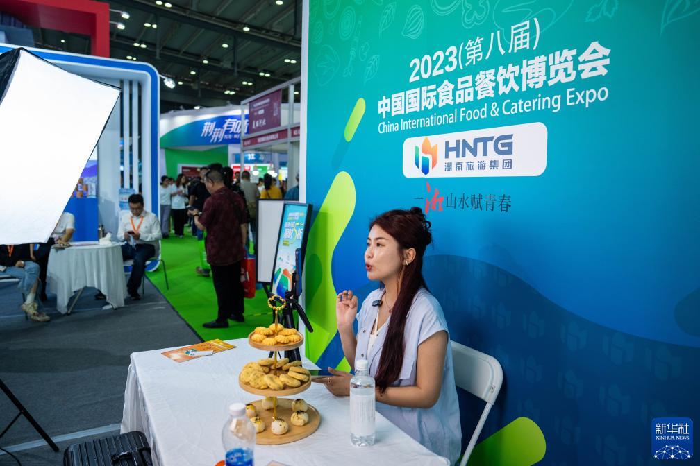 9月15日,在長沙國際會展中心,參展商通過直播推銷糕點。