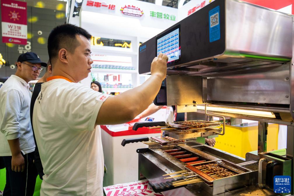 9月15日,在長沙國際會展中心,參展商在展示自動燒烤機操作方法。