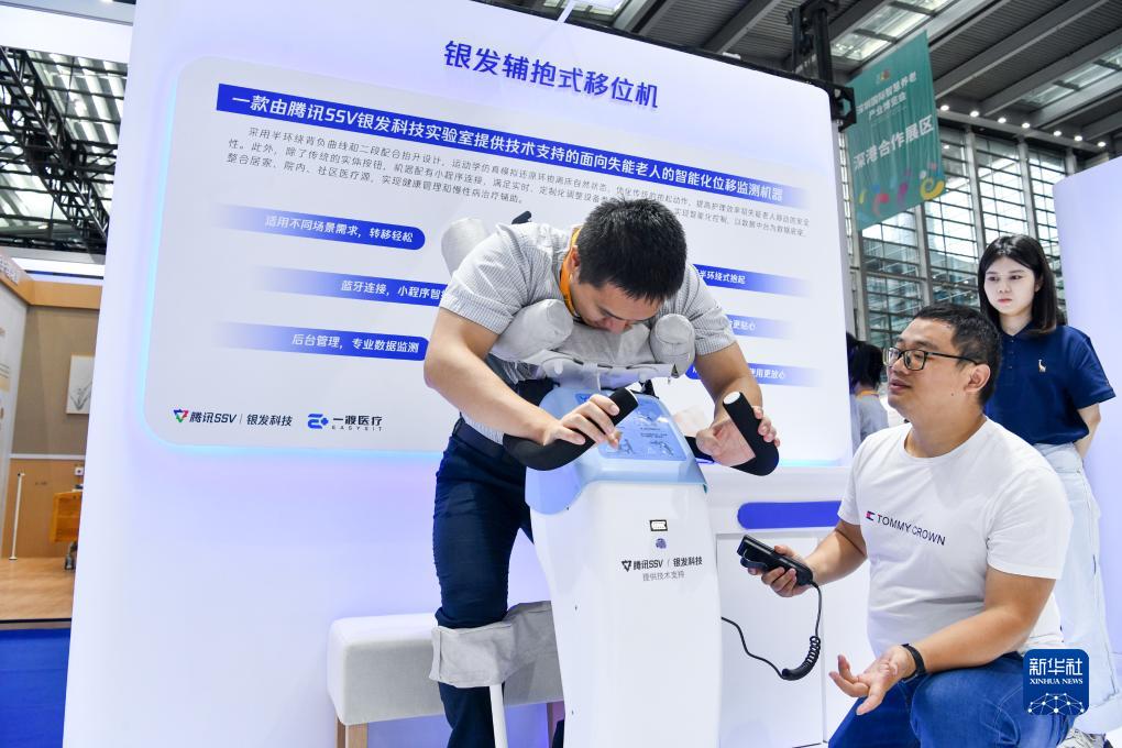 9月15日,觀眾在深圳智慧養老展上體驗失能老人智能化照護産品——銀發輔抱式移位機。