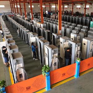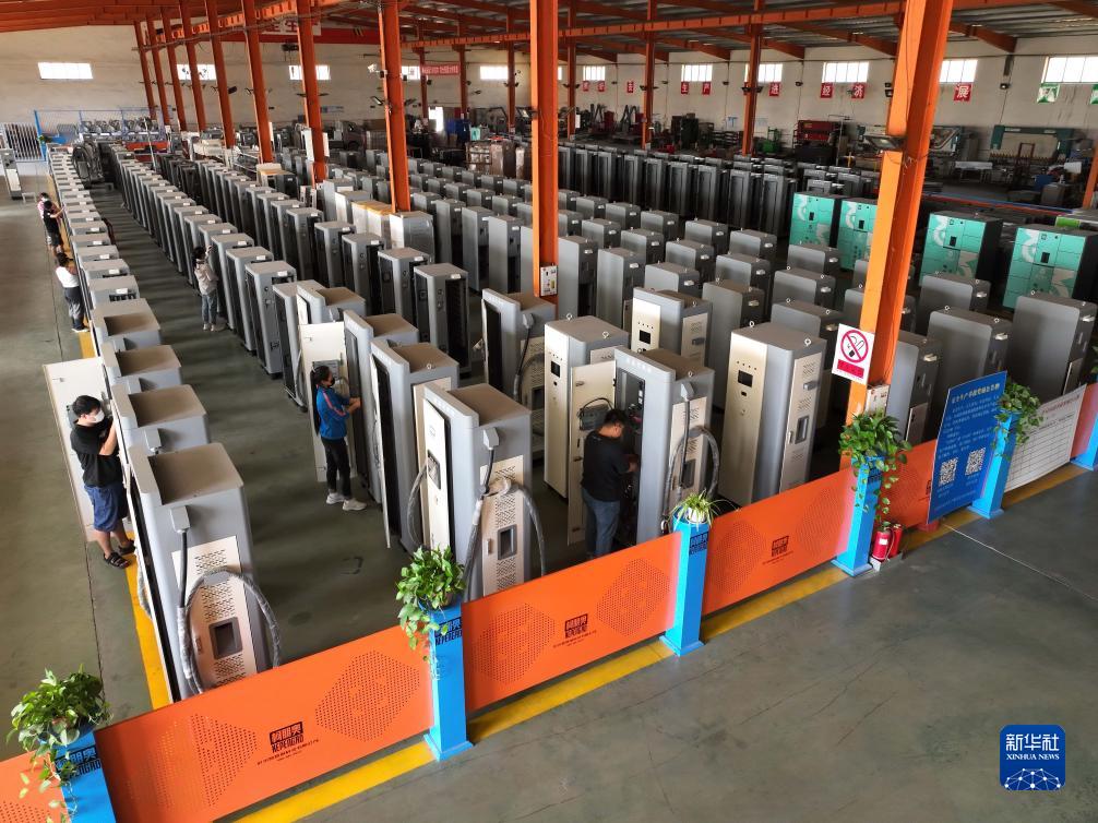 9月15日,工作人員在滄州智慧城科技有限公司生産車間對直流充電樁進行安裝與檢測(無人機照片)。
