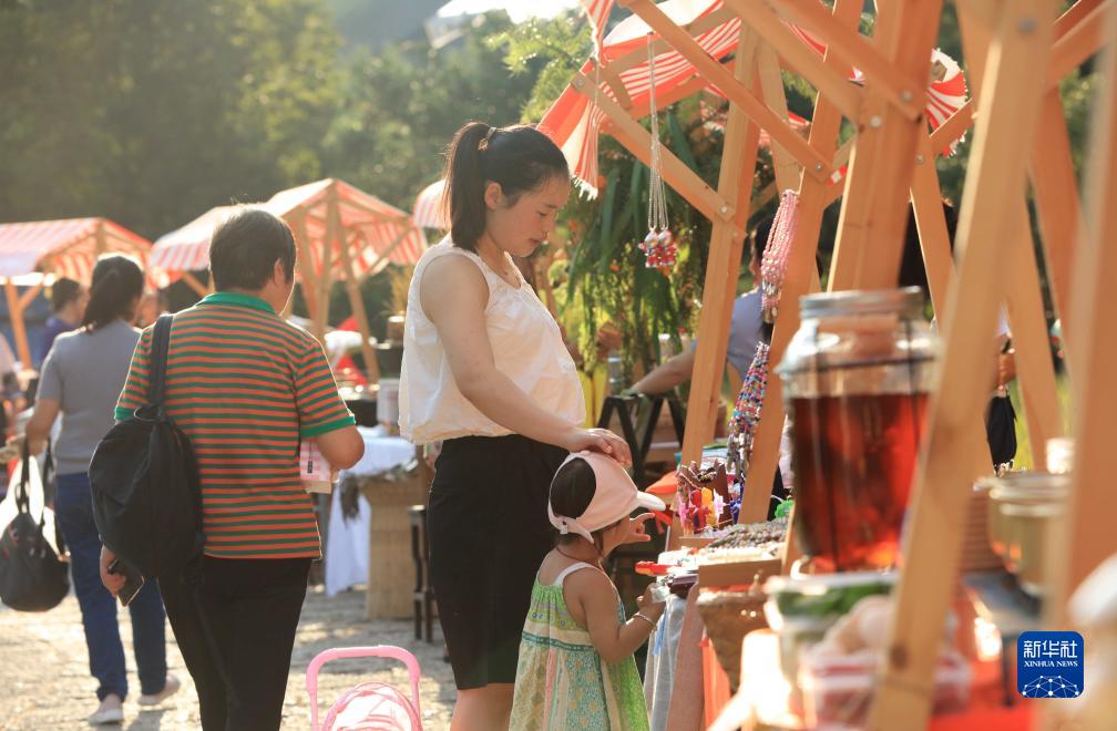 9月15日,游客在張家界市武陵源區黃龍洞景區“田園市集慶秋收”活動中挑選手工藝品。