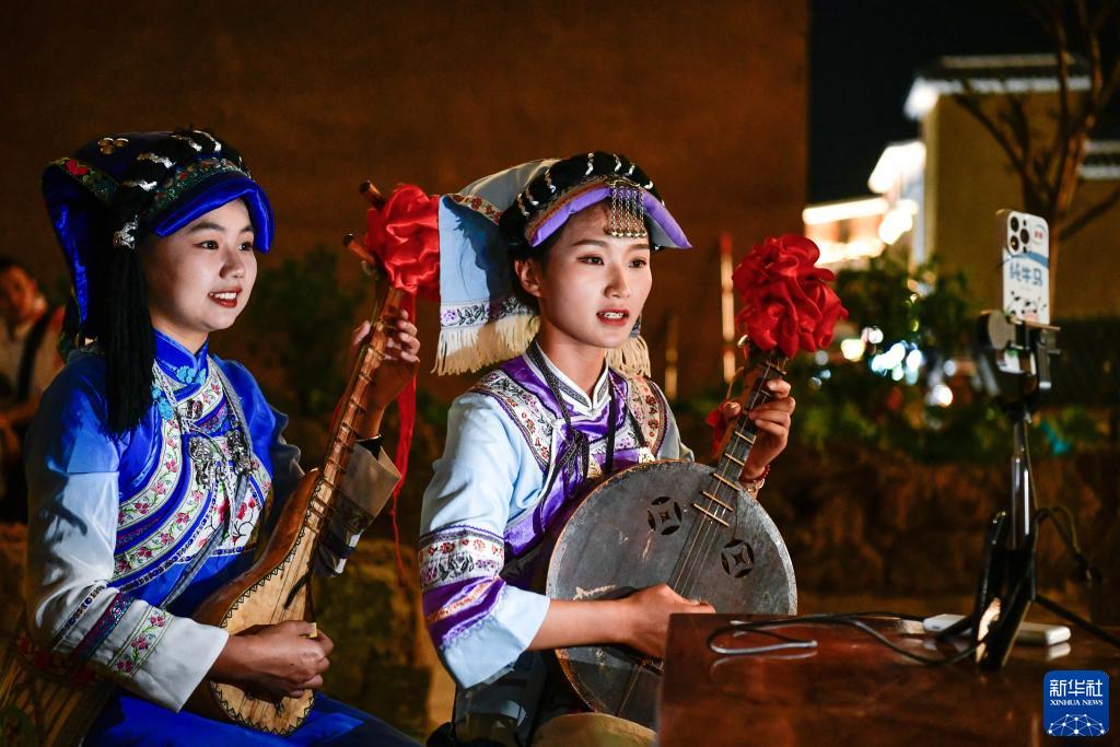 9月14日,少數民族姑娘在興義市萬峰林街道的“鄉愁集市”直播民族樂器彈唱。