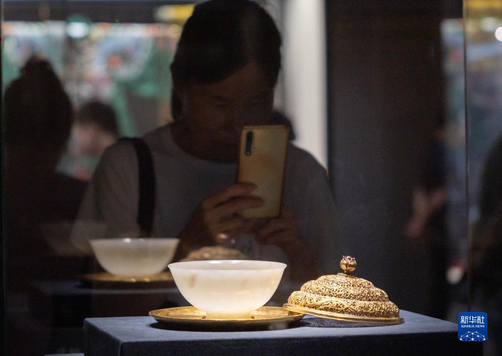 9月15日,觀眾在展覽上拍攝鏤空金蓋金托盤玉碗。