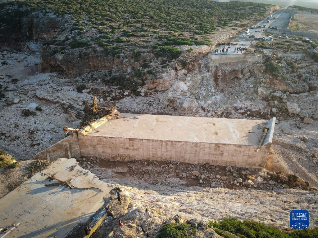 這是9月15日在利比亞東部德爾納附近拍攝的被毀的橋梁(航拍照片)。