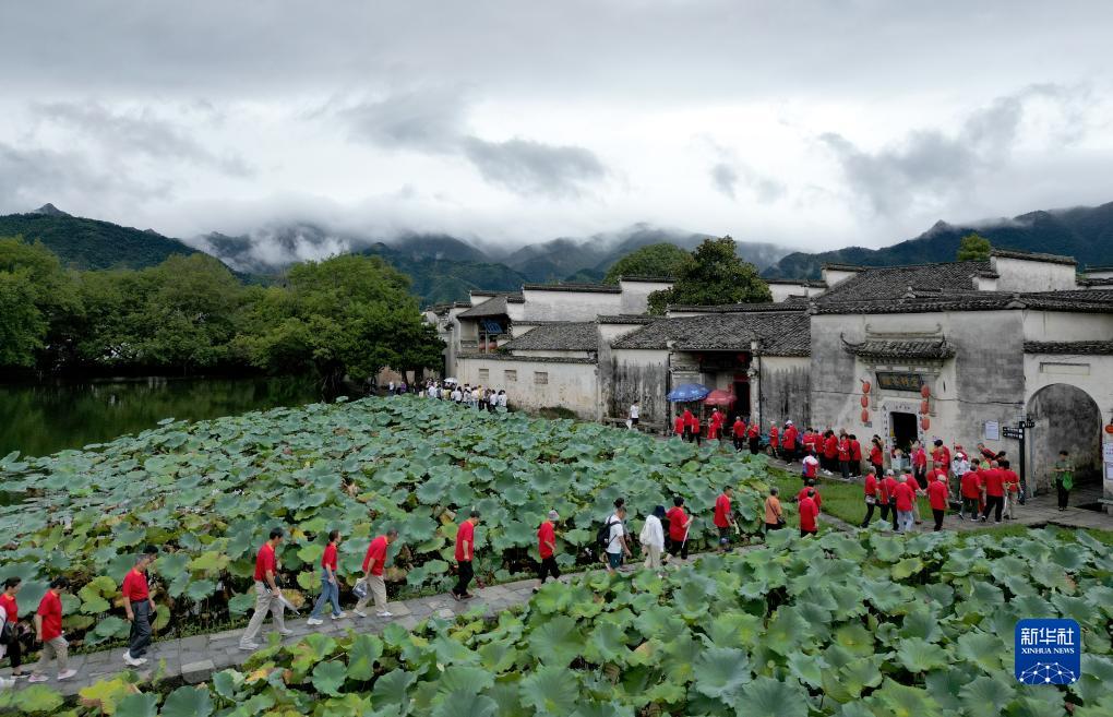 這是游客們在黃山市黟縣宏村內游覽(9月13日攝,無人機照片)。