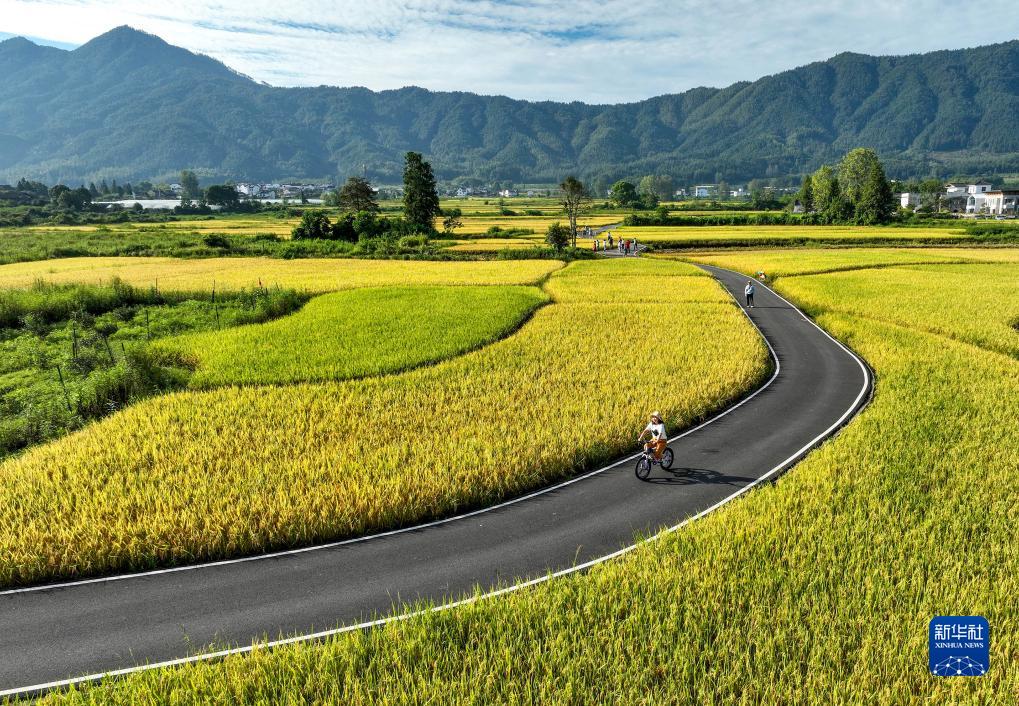 一位游客在黃山市黟縣碧陽鎮關麓古村附近騎行(9月2日攝) 。