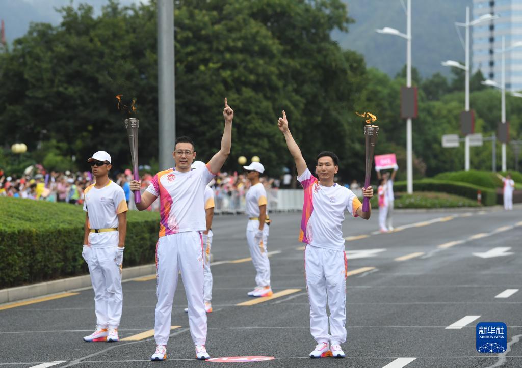 9月16日,火炬手葛宏磚(右)和郝傑在火炬傳遞中。