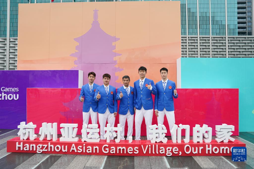 9月16日,中國體育代表團成員王昶、梁偉鏗、陳其遒、劉雨辰、歐烜屹(從左到右)在亞運村合影。