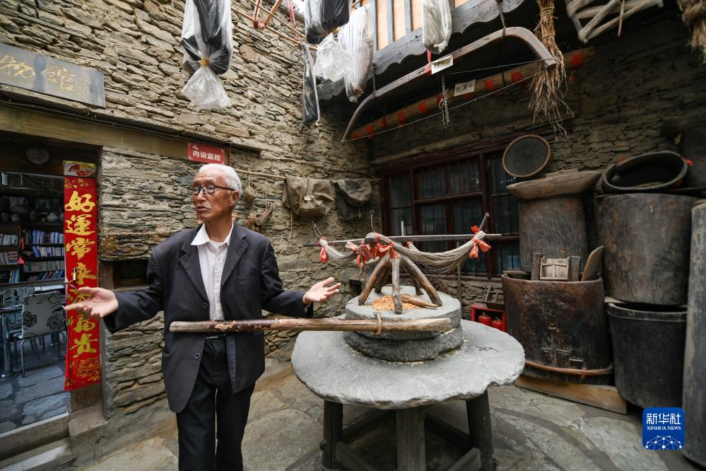 創辦“桃坪羌族文化博物館”的王嘉俊老人在演示羌族“腰磨”的用法(9月13日攝)。