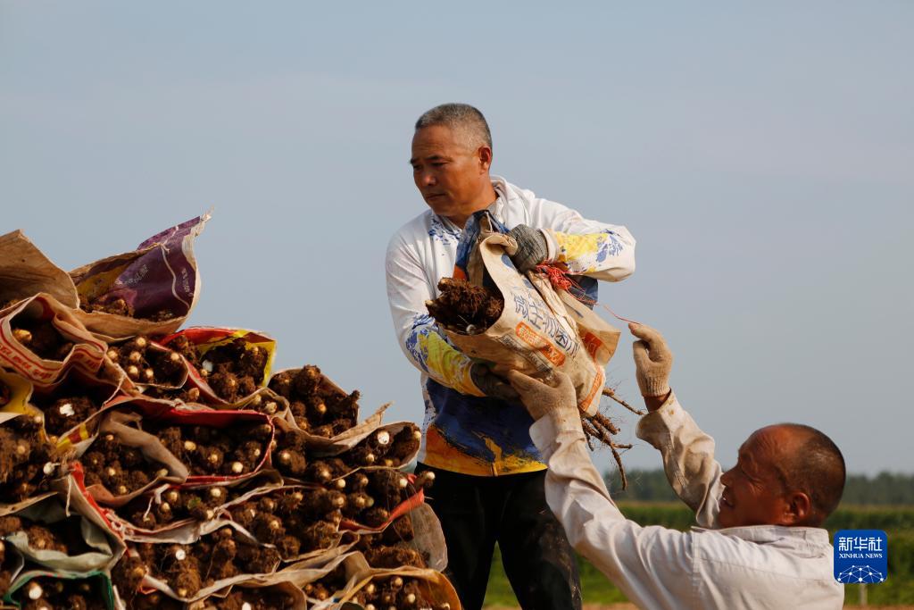 9月15日,河南省焦作市溫縣黃莊鎮米莊村農民在田間搬運剛收穫的鐵棍山藥。