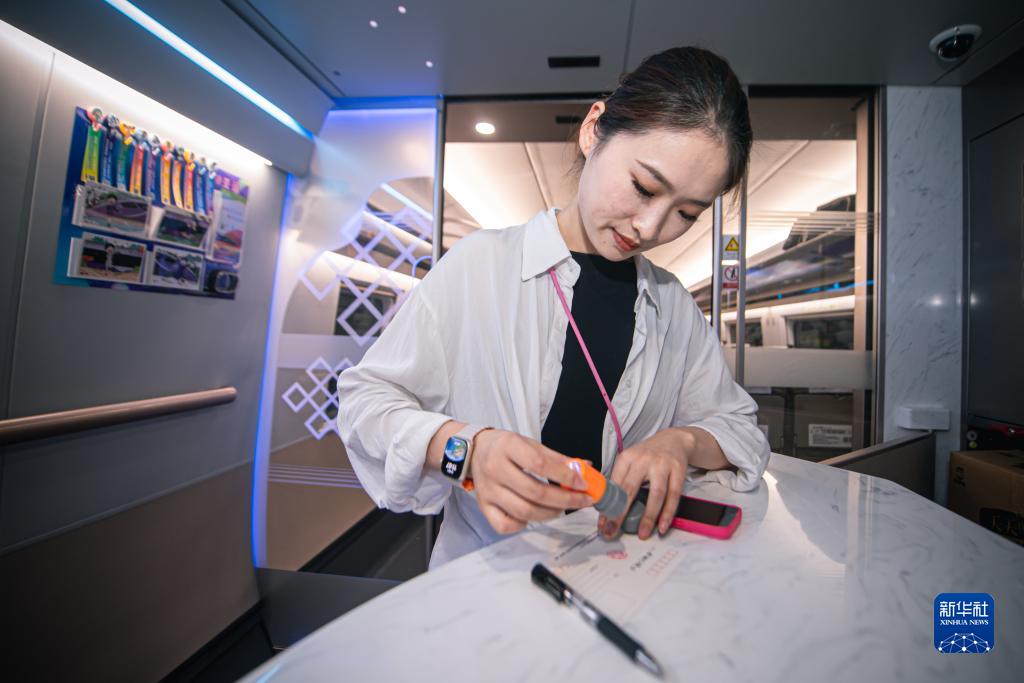 9月16日,在復興號亞運智能動車組列車上的亞運文創角,一名乘客寫明信片並蓋章留念。