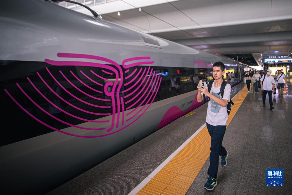 9月16日,乘客在杭州東站站&拍攝復興號亞運智能動車組列車。