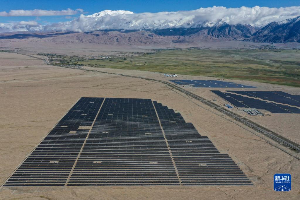 在新疆塔什庫爾幹塔吉克自治縣塔合曼鄉拍攝的一處大型光伏發電項目(8月27日攝)。