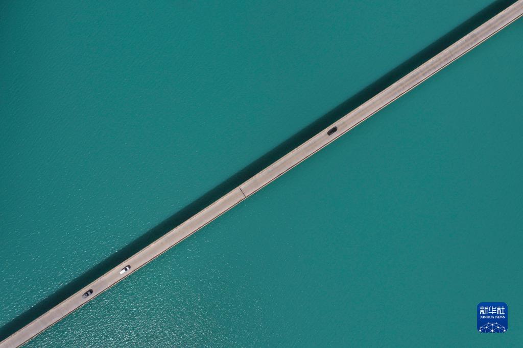 游客駕車穿行在新疆塔什庫爾幹塔吉克自治縣“班迪爾藍湖”上方的大橋上(8月28日攝,無人機照片)。