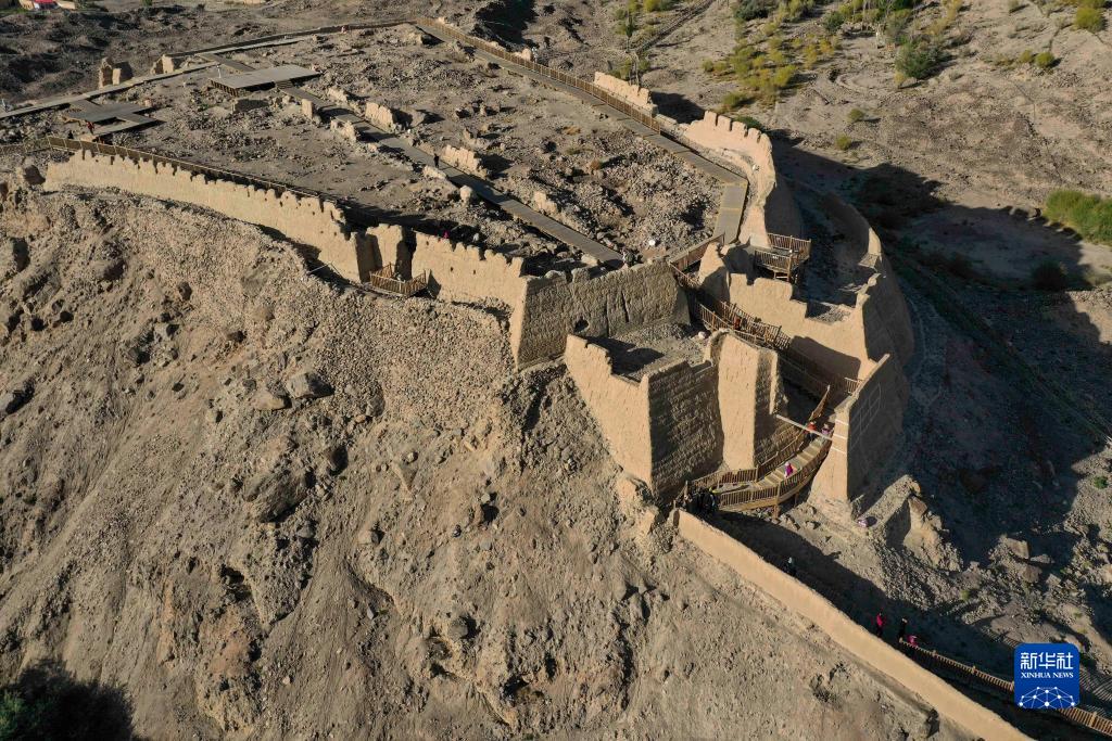 游客在新疆塔什庫爾幹塔吉克自治縣石頭城遺址游玩(8月28日攝,無人機照片)。