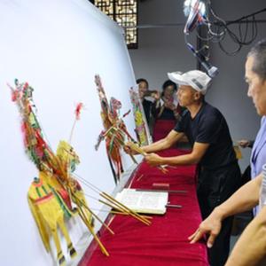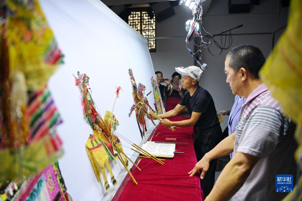 9月16日,皮影戲藝人在玉田縣“非遺會客廳”皮影工坊內表演皮影戲。
