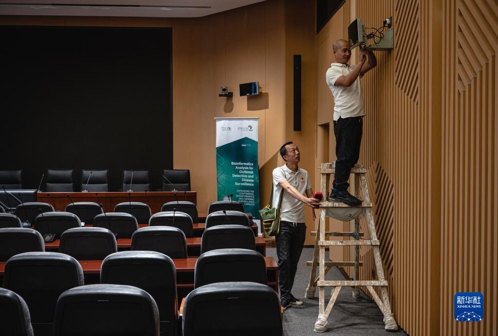 9月11日,中方技術服務組成員在埃塞俄比亞首都亞的斯亞貝巴非洲疾控中心總部大樓內檢查會議同聲傳譯系統。