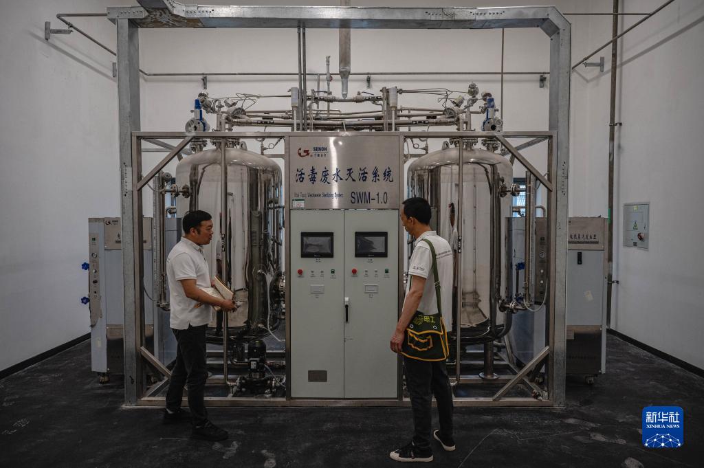 9月11日,中方技術服務組成員在埃塞俄比亞首都亞的斯亞貝巴非洲疾控中心檢查待投入使用的p3實驗室活毒廢水處理系統。