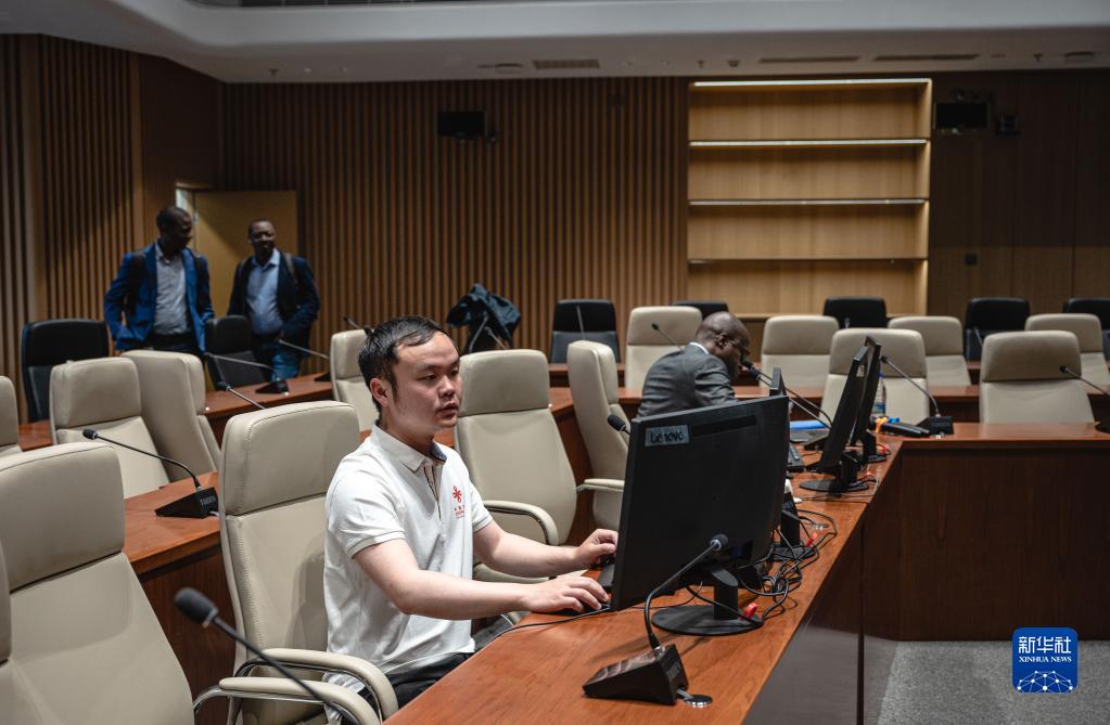 9月11日,中方技術服務組組長楊宇傑在埃塞俄比亞首都亞的斯亞貝巴非洲疾控中心總部大樓內測試會議系統。