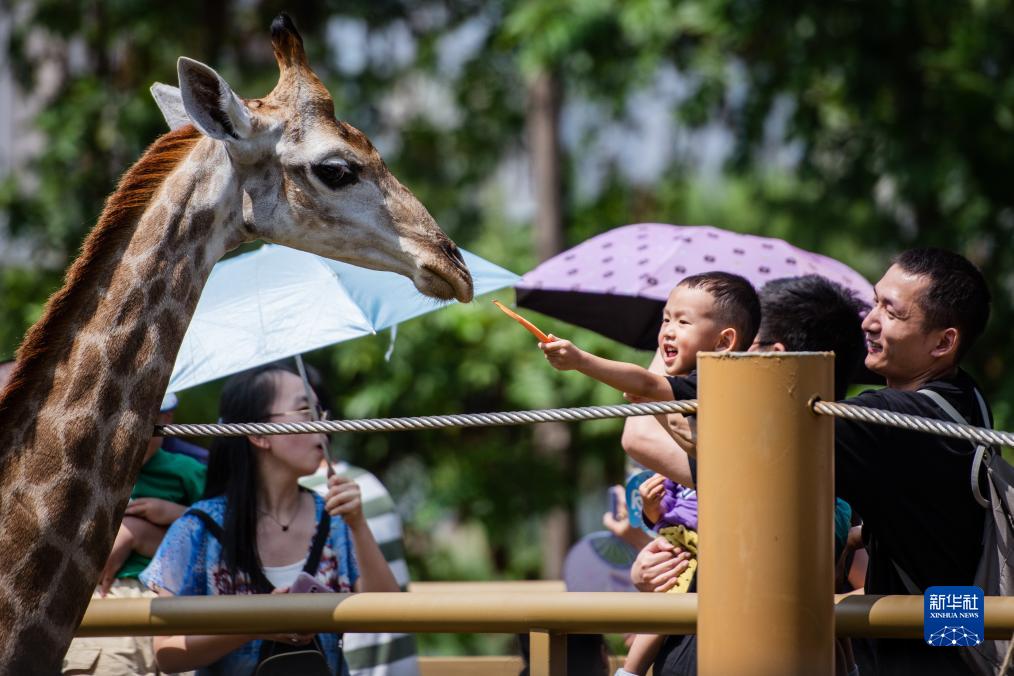 9月16日,游客在武漢動物園與長頸鹿互動。