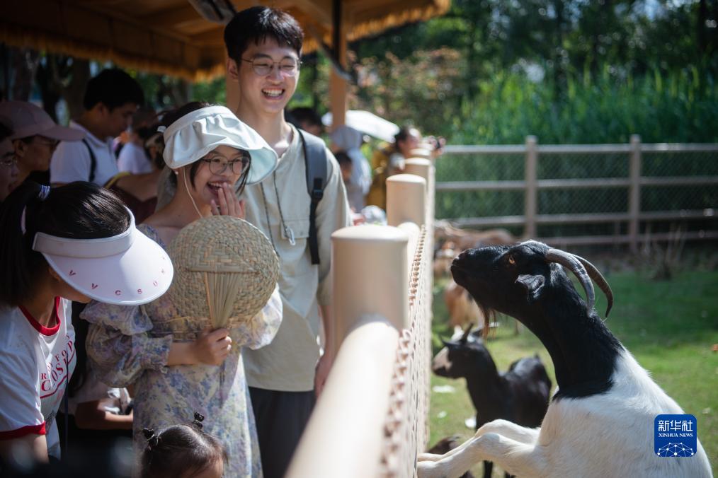 9月16日,游客在武漢動物園與動物互動。