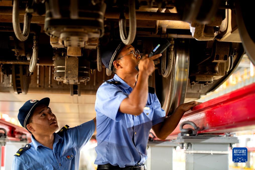 9月13日,高春成(左)和同事對復興號智能配置動車組進行走行部檢查。