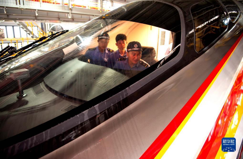 9月13日,高春成(右)和同事在復興號智能配置動車組駕駛艙進行檢測。