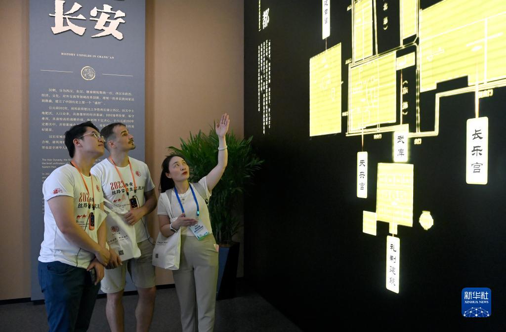 9月16日,外國留學生在西安未央區漢長安城遺址內的漢長安城歷史文化與遺址保護展示廳參觀。