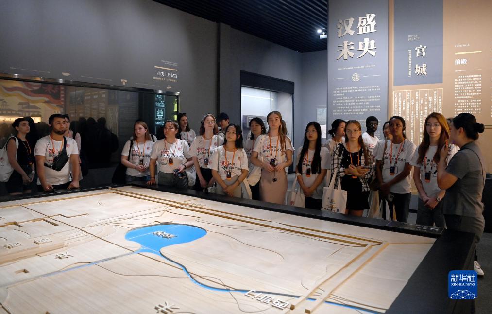 9月16日,外國留學生在西安未央區漢長安城遺址內的漢長安城歷史文化與遺址保護展示廳參觀。
