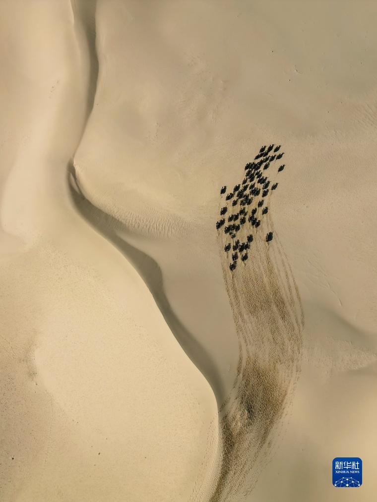 9月14日在阿爾金山國家級自然保護區庫木庫裏沙漠拍攝的一群野牦牛(無人機照片)。