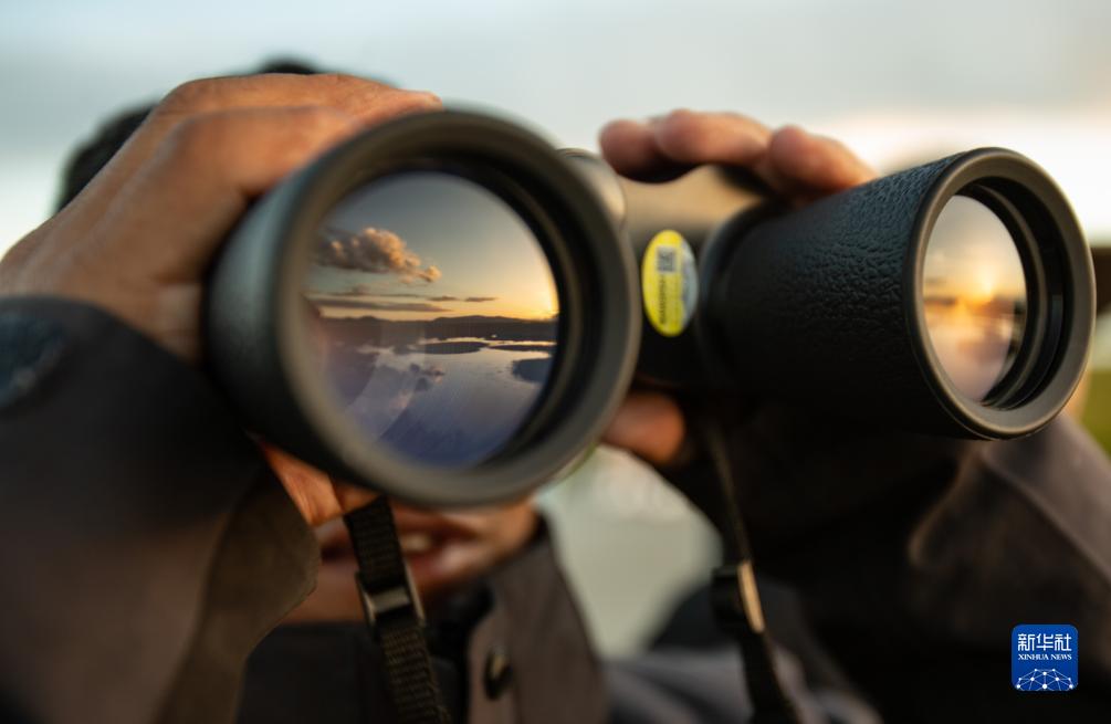 濕地生態管護員如科在四川省阿壩藏族羌族自治州若爾蓋縣花湖用望遠鏡觀察周邊環境(8月22日攝)。