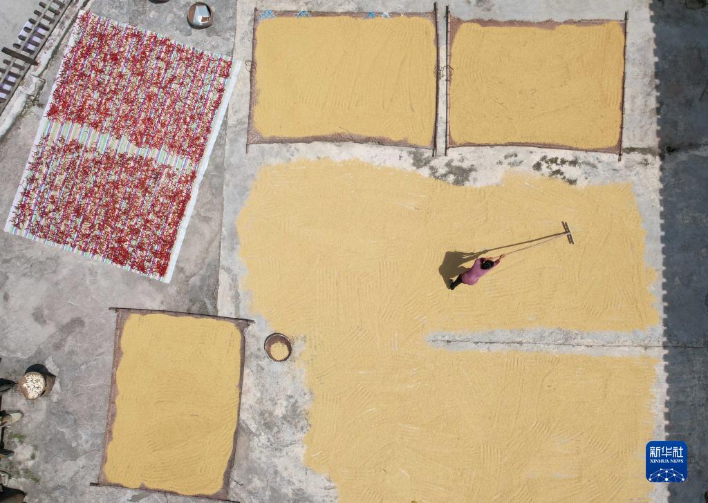 金秋時節,各地農民抓住晴好天氣晾曬收穫的高粱、水稻、玉米等糧食作物,呈現多彩的豐收圖景。