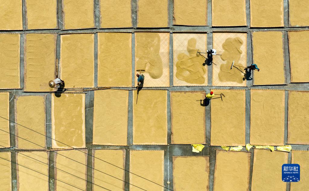 金秋時節,各地農民抓住晴好天氣晾曬收穫的高粱、水稻、玉米等糧食作物,呈現多彩的豐收圖景。