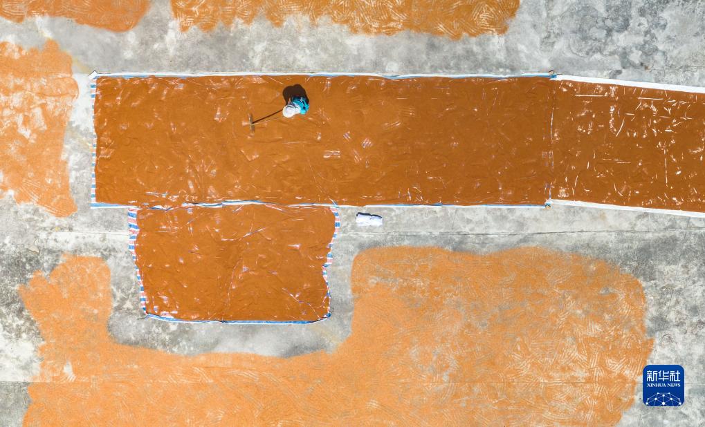 9月16日,農民在貴州省安順市西秀區大西橋鎮吉昌村晾曬高粱(無人機照片)。