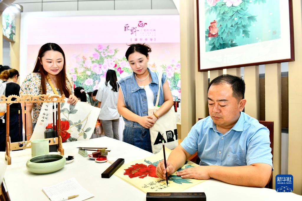 9月16日,在山東國際會展中心,來自巨野書畫院的藝術工作者侯福常(右一)在展示工筆牡丹畫技藝。