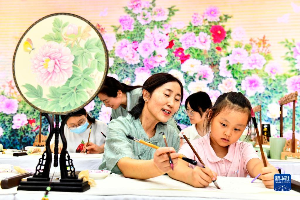 9月16日,在山東國際會展中心,來自巨野書畫院的藝術工作者姚愛紅教孩子給工筆牡丹畫上色。