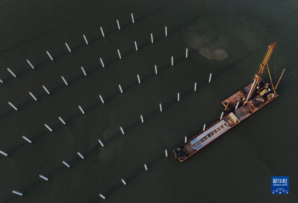 9月16日,工人在河北省唐山市豐南區黑沿子鎮“漁光一體”現代漁業産業園二期工程建設工地施工(無人機照片)。