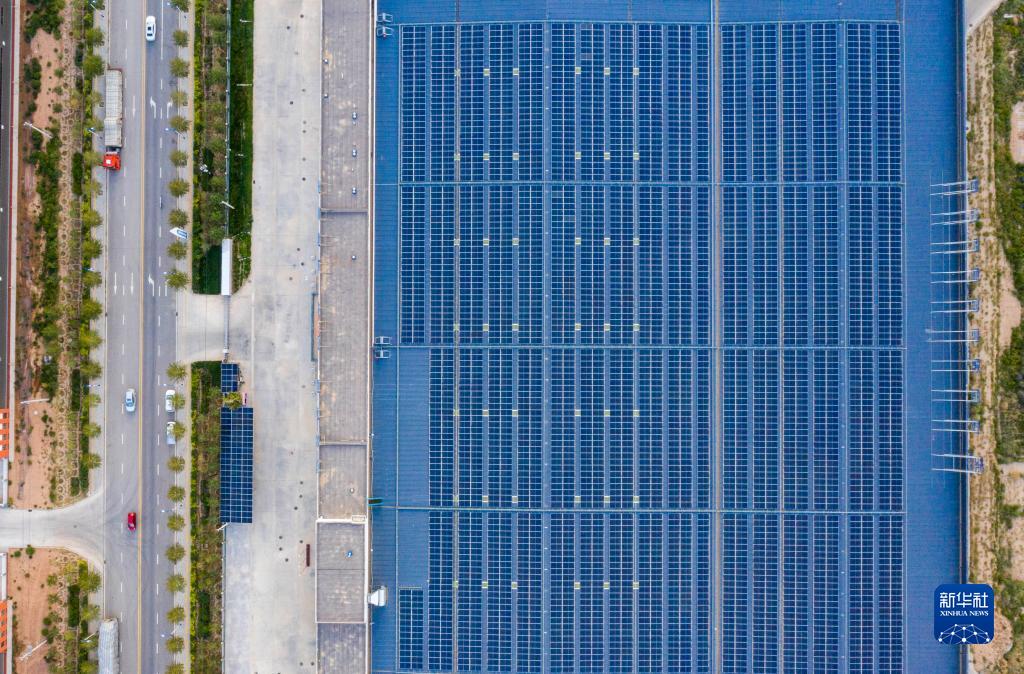 這是9月15日拍攝的位於寧夏吳忠市同心縣的清潔能源産業園內某企業屋頂已並網發電的光伏板(無人機照片)。