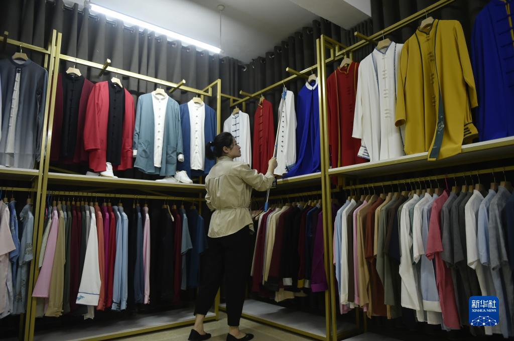 9月15日,河南溫縣陳家溝一家服裝生産企業的工作人員在展廳整理太極練功服。