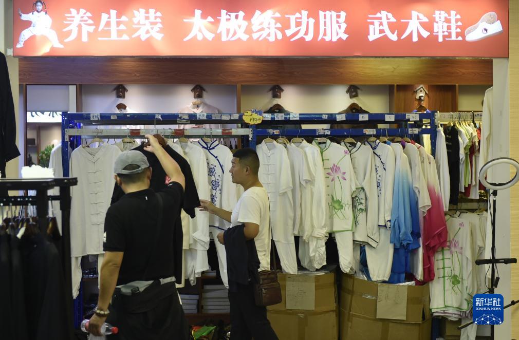 9月15日,游人在河南溫縣陳家溝的一家店舖內挑選太極練功服。