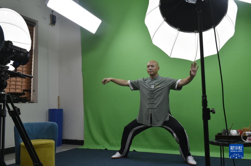 9月15日,太極拳傳人王戰軍在河南溫縣陳家溝自己的武校直播間內,通過網絡直播推廣太極拳。