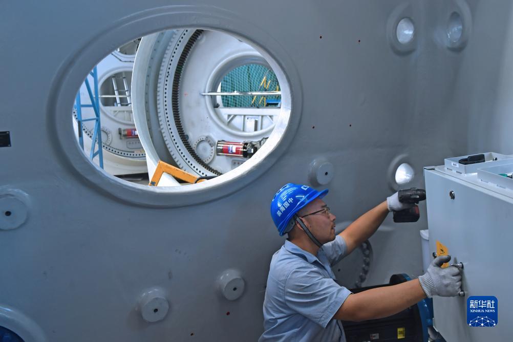9月13日,中國船舶集團旗下中船海裝大連公司的裝配工在實施海上風電機組輪轂控制櫃的安裝工作。