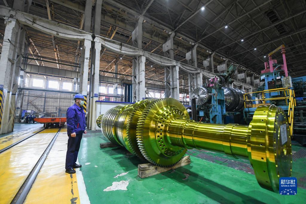 在哈電集團哈爾濱汽輪機廠有限責任公司的生産車間,工人在生産作業(2022年10月27日攝)。