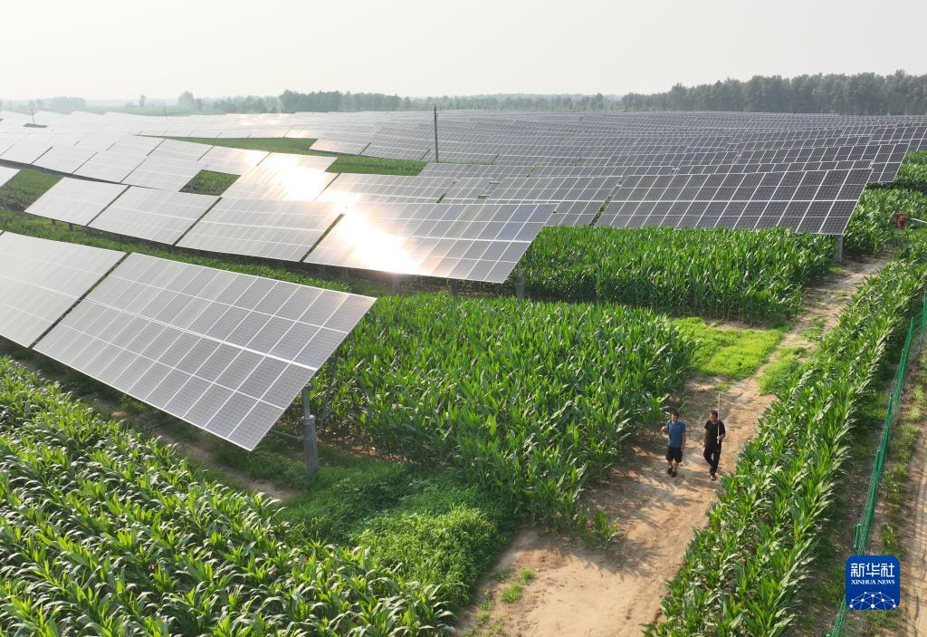 在遼寧省彰武縣馮家鎮哈大冷村,村民經過太陽能光伏發電設備(7月11日攝,無人機照片)。