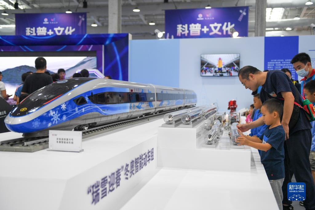 9月17日,在全國科普日北京主場活動展區,參觀者參觀展出的高鐵模型。